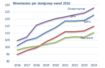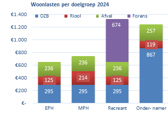 Voor het bepalen van de hoogte van de OZB-aanslag is uitgegaan van een gemiddelde woningwaarde van € 337.000 en van een gemiddelde waarde van € 174.000 voor een bedrijfsgebouw. De gemeentelijke lasten voor de inwoners neemt gemiddeld met 2,5% toe voor zowel een één- en een meerpersoonshuishouding. Voor een recreant is dit eveneens 2,5%. De lasten voor een ondernemer stijgen met bijna 3%. De grafiek toont de lastenontwikkeling over de periode 2016 – 2024.